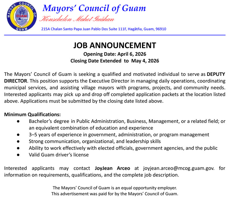 Mayor's Council of Guam Regular Monthly Meeting - May 6, 2026 at 10:00 AM Meetings Posted On: 05-06-2026 Meetings