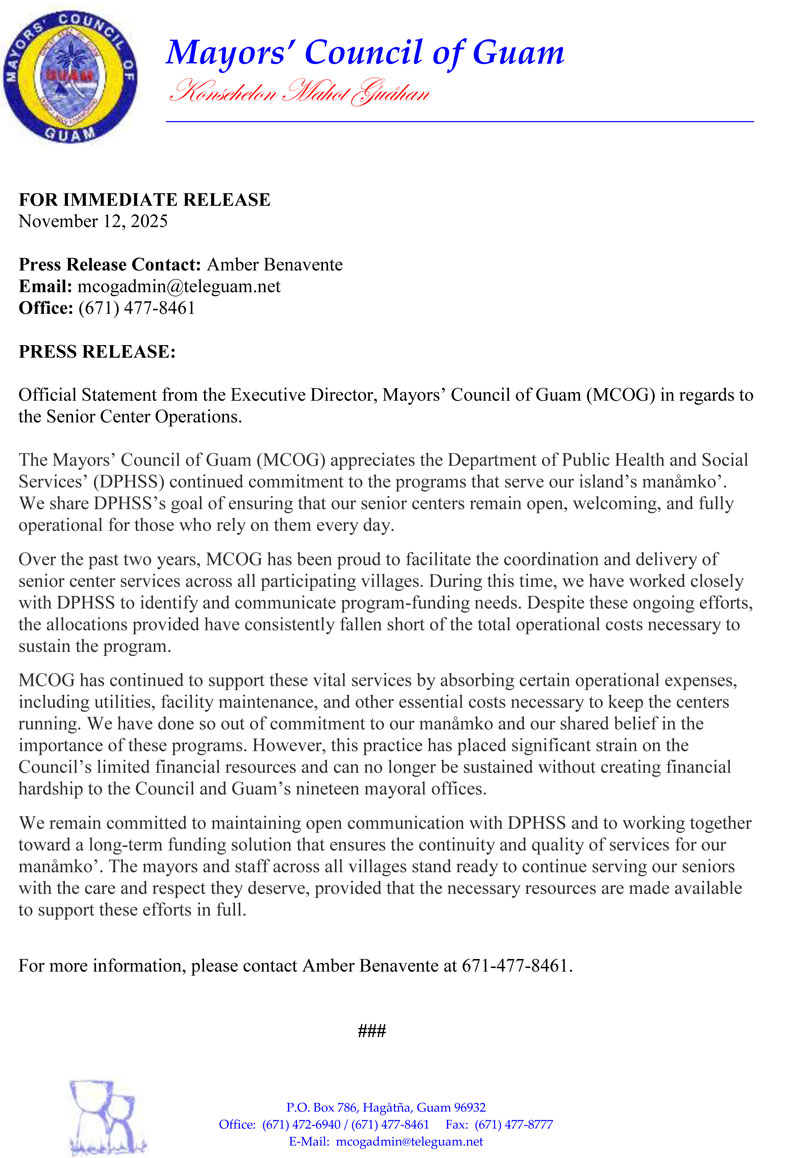 Press Release: Official Statement from the Executive Director, Mayors’ Council of Guam (MCOG) in regards to the Senior Center Operations